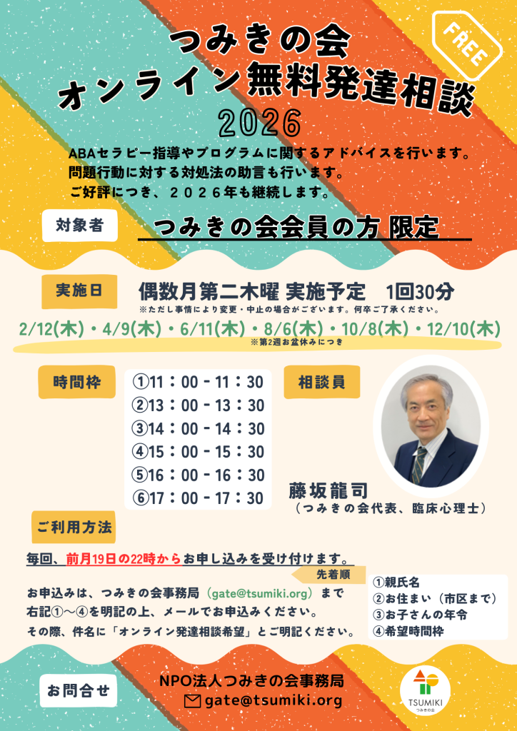 2025.12.11 イベント オンライン無料発達相談2026のご案内 代表藤坂によるオンライン無料発達相談2026のご案内です。偶数月第2木曜日に実施予定です。 ★こちらは、つみきの会会員限定となっております★ご興味のある方は、ぜひご入会の上、受付開始時にお申込みください。つみきの会 一覧に戻る